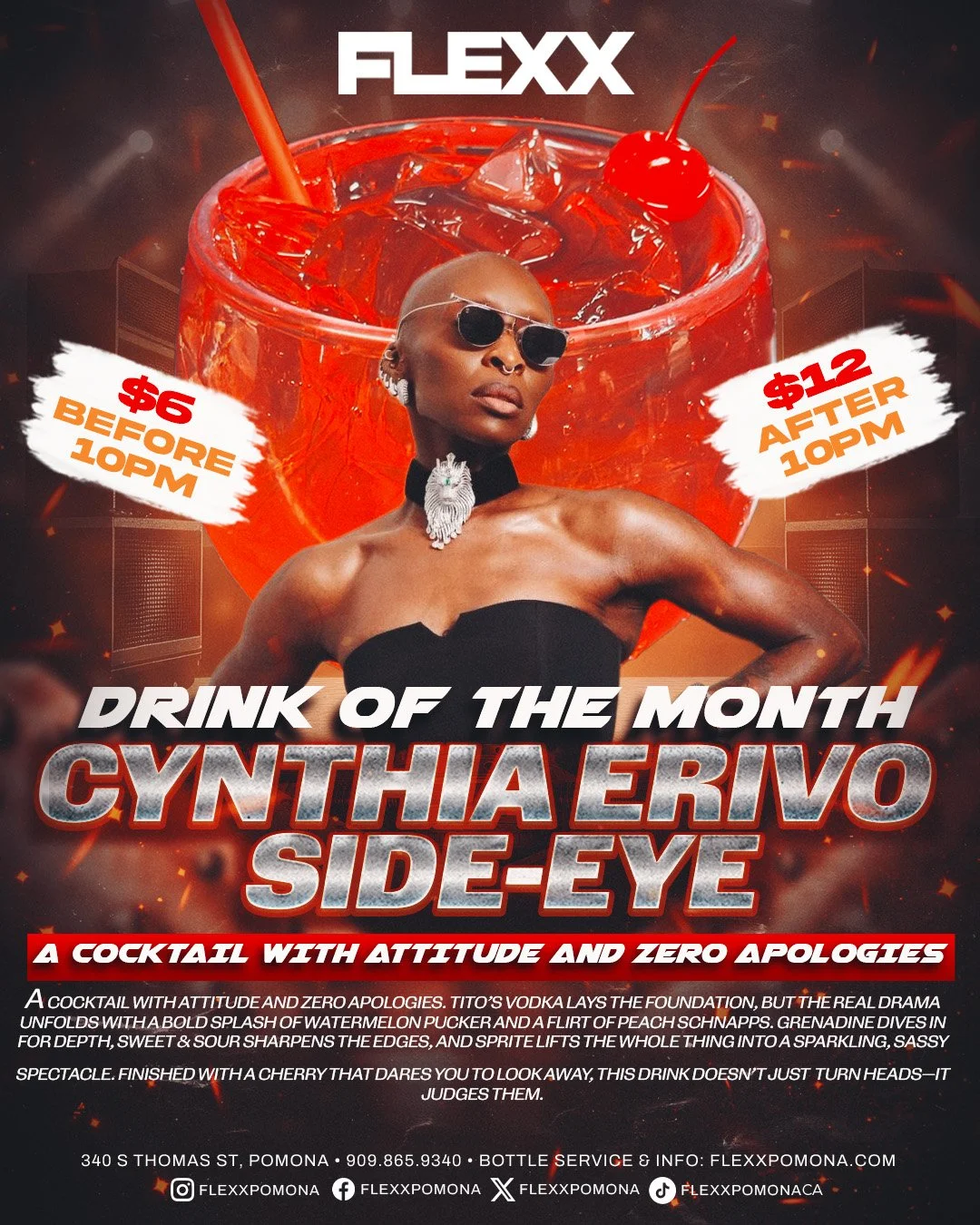 Cîroc Vodka, peach schnapps, cranberry juice, and a splash of Sprite, finished with a cherry garnish—fierce, fresh, and ready to slay.