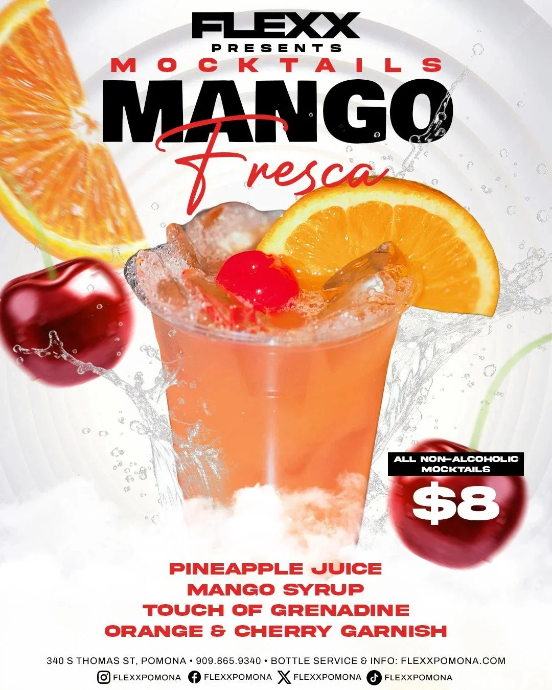 Juicy and refreshing with main-character energy. Pineapple juice and mango syrup with a flirt of grenadine, garnished with an orange and cherry.