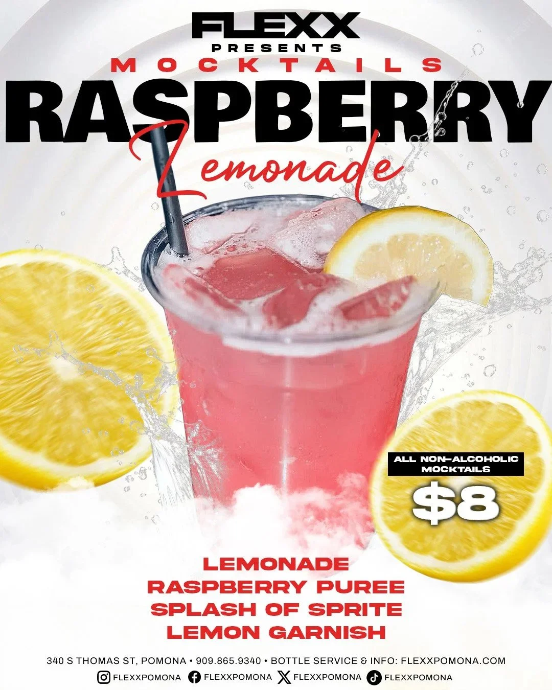 Bright, tart, and ready to twirl. Lemonade and raspberry purée with a splash of Sprite, garnished with a lemon.