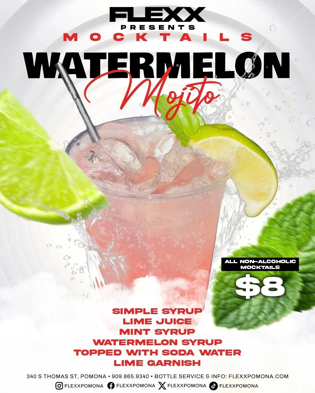 Fresh, flirty, and poolside-coded. Lime juice, simple syrup, mint syrup, and watermelon syrup topped with soda water and finished with a lime.