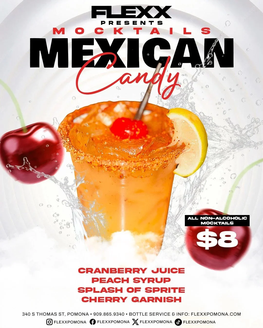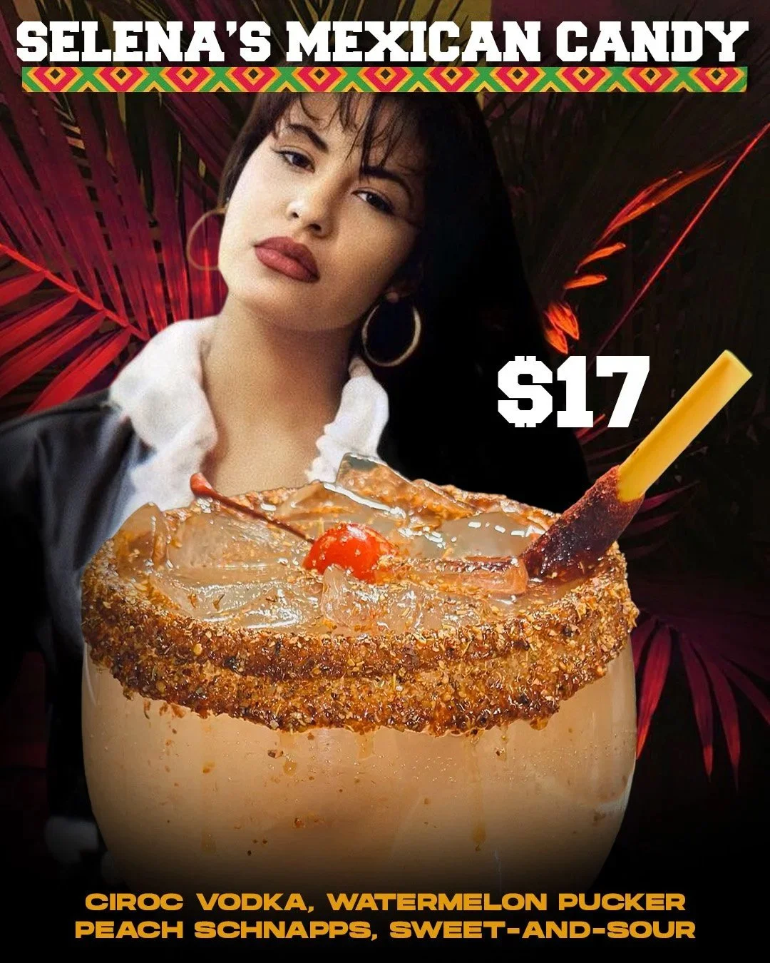 Sweet, tangy, and a little spicy. Pineapple juice and sweet & sour drizzled with chamoy, rimmed in Tajín, and garnished with a lime and cherry. She bites back.